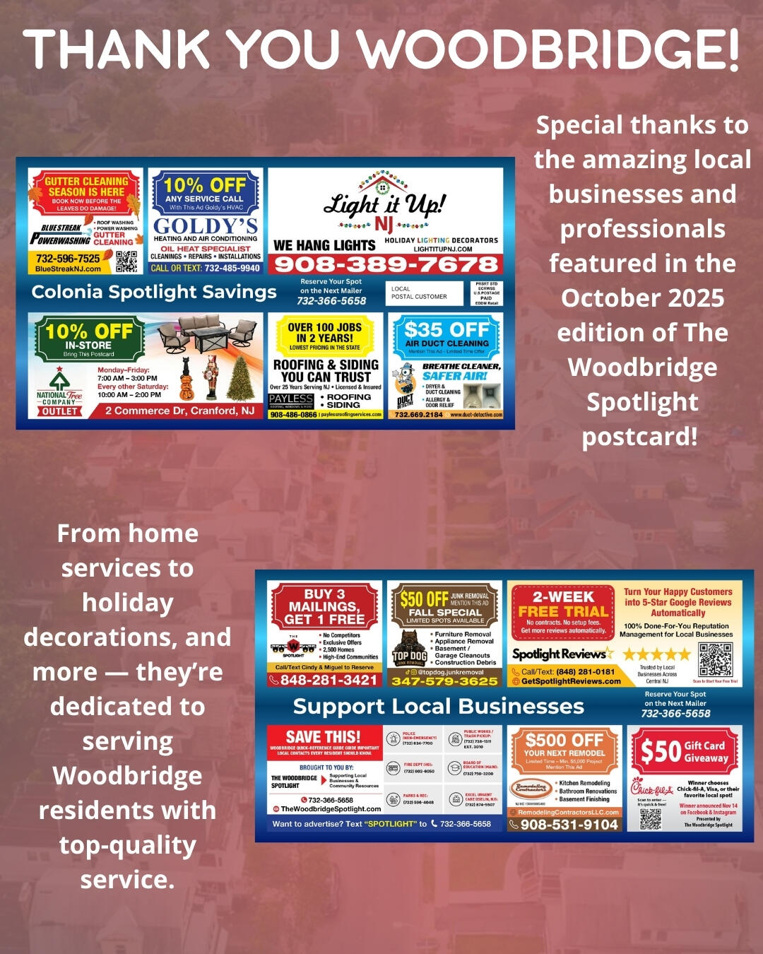 We’re celebrating the October 2025 edition of The Woodbridge Spotlight — your local business postcard mailer — with a special giveaway!